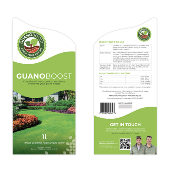 Guanoboost fertilizer is formulated with a special blend of nutrients to encourage healthy, green lawns. Rich in minerals and trace elements & large quantities of Organic Carbon and Fulvic Acid that increases the uptake of essential nutrients that is available in your soil.