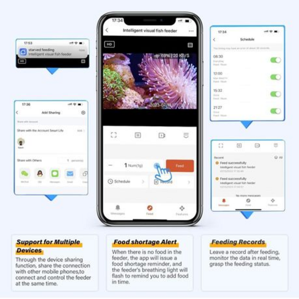 The fish feeder is visual, it is equipped with a 2K HD camera which allows you to monitor the aquarium remotely. You can take photos and record videos through the app, and share them with your family.
