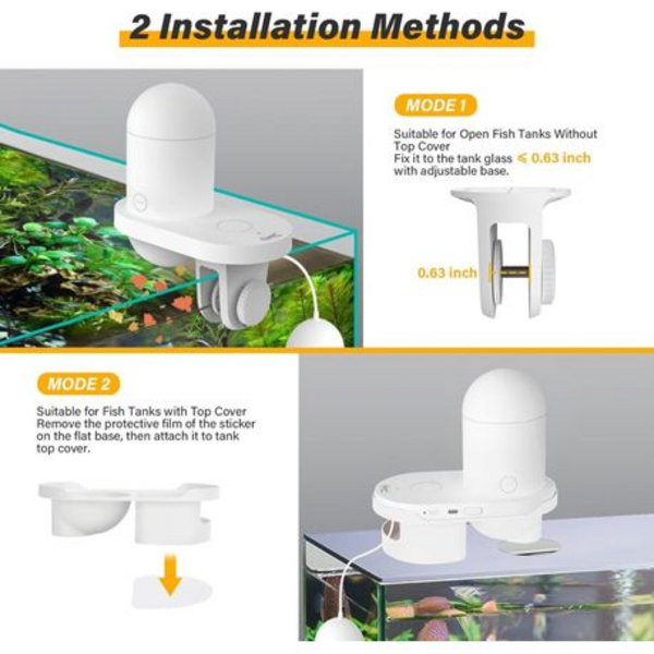 You can use the adjustable clips to fix the feeder to the edge of the tank, or use the included stickers to attach it to the tank lid. It is suitable for most square fish tanks. The hygger Wi-Fi fish feeder uses a USB cable to connect to home electricity (a 5ft USB cable is included) and can be powered by a power bank. It comes with a 12-month warranty.