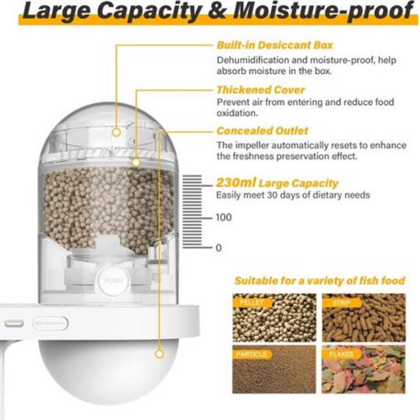 The hygger intelligent fish feeder adopts a moisture-proof design to ensure the freshness of food without getting wet or clogged. The double-sealed compartments and dedicated drying space keep the fish food fresh and moisture-proof.
