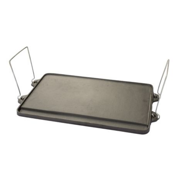 A traditional cast iron pan with a smooth surface on the one side for frying and a ribbed surface on the other side for grilling. Finished with two handles for easy carry and hanging during storage.