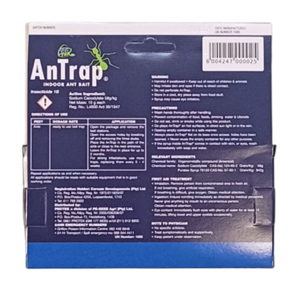 Protek AnTrap is a ready-to-use ant bait station containing Sodium Cacodylate 58 g/kg. It effectively eliminates the entire nest, including the queen, within one week.